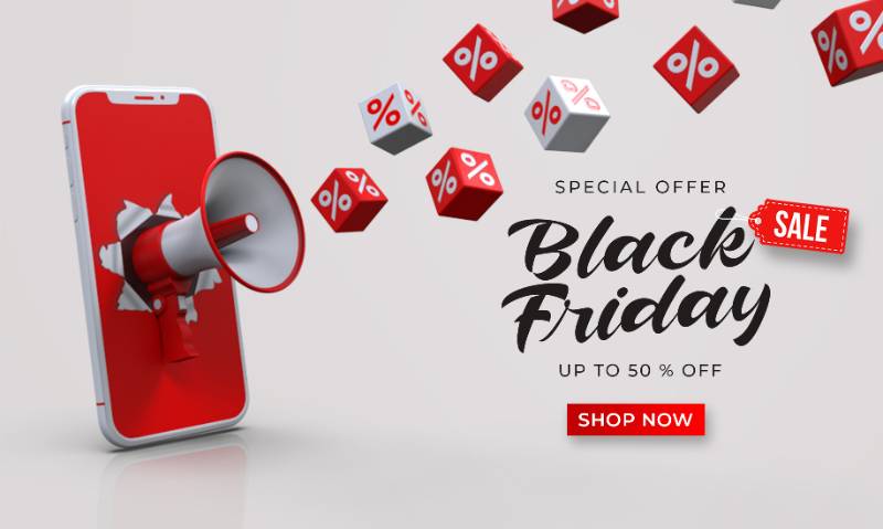black friday sale banner template with 3d megaphone out smartphone