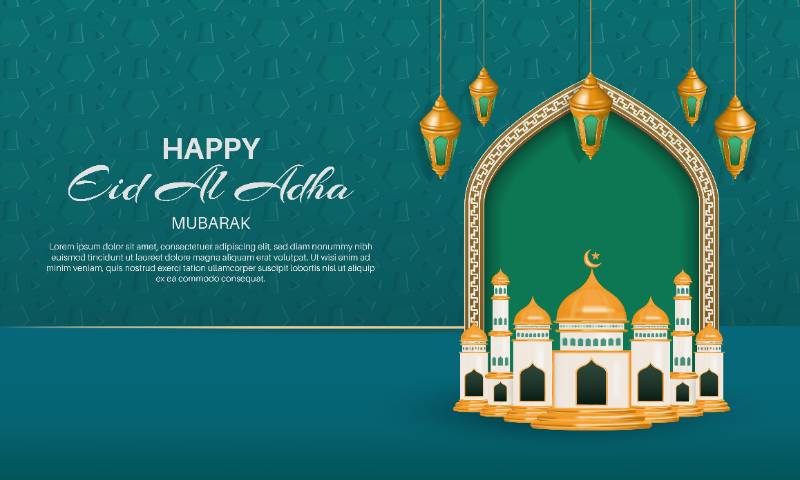 happy eid al adha mubarak banner template with golden dome mosque