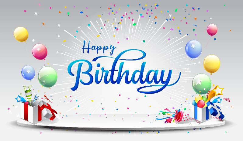 happy birthday celebration banner with confetti balloons