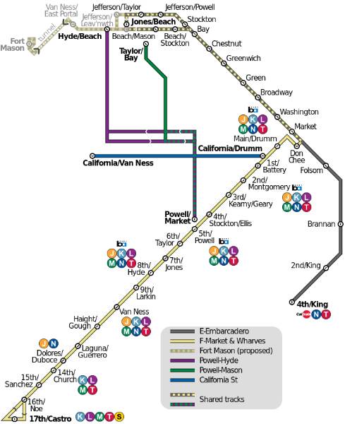 san francisco cable car system f market tram e embarcadero powell street station route